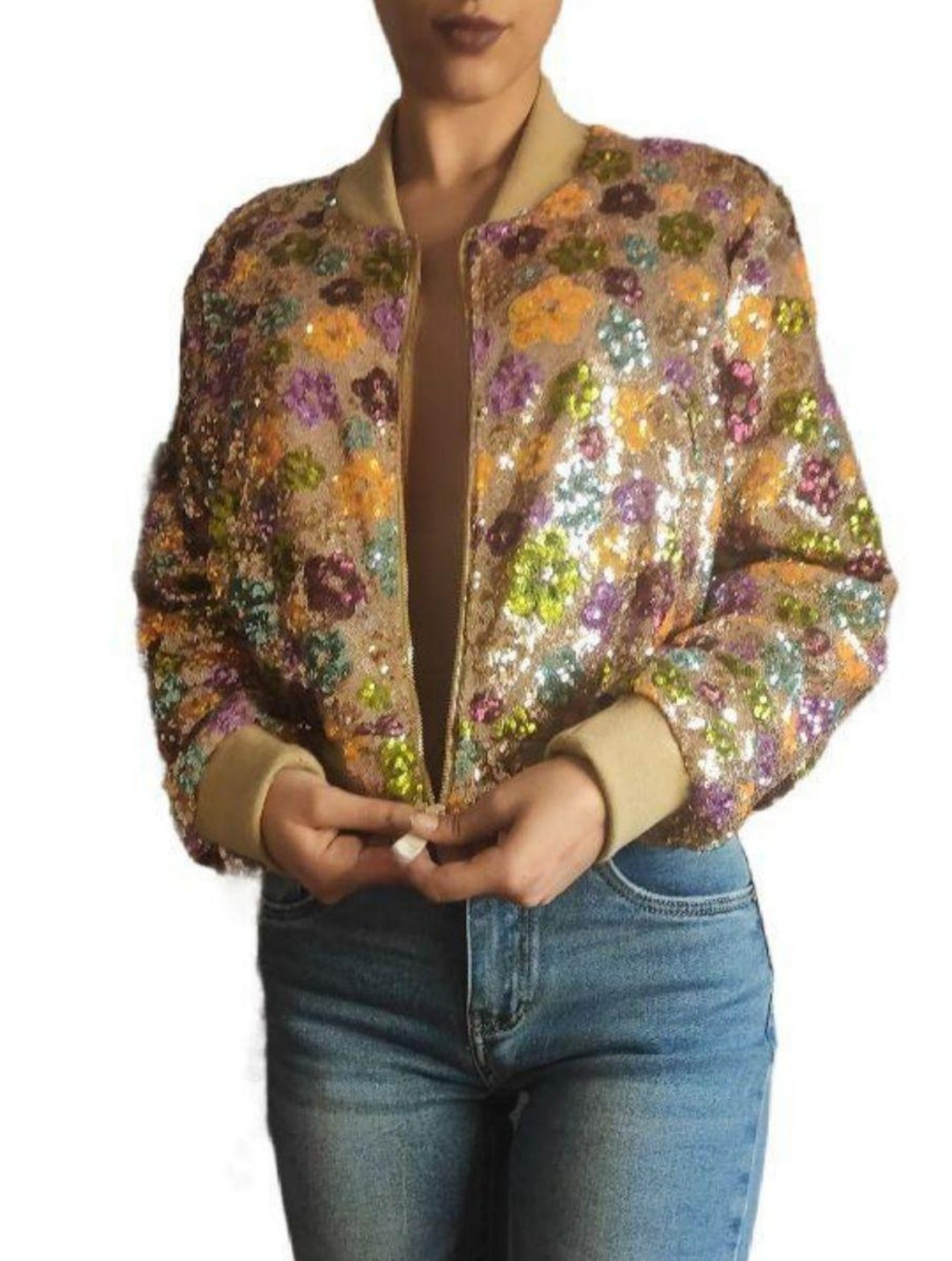 Add the coordinated bomber jacket and the leather bag.