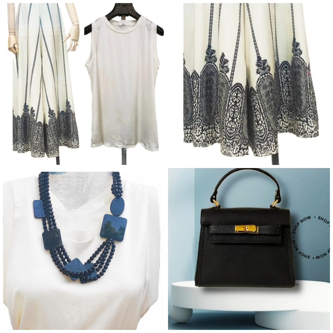 Ivory palazzo pants with black lace print. ONE size: fits from 34 to 44. Matching ivory top available. VALENCIA set