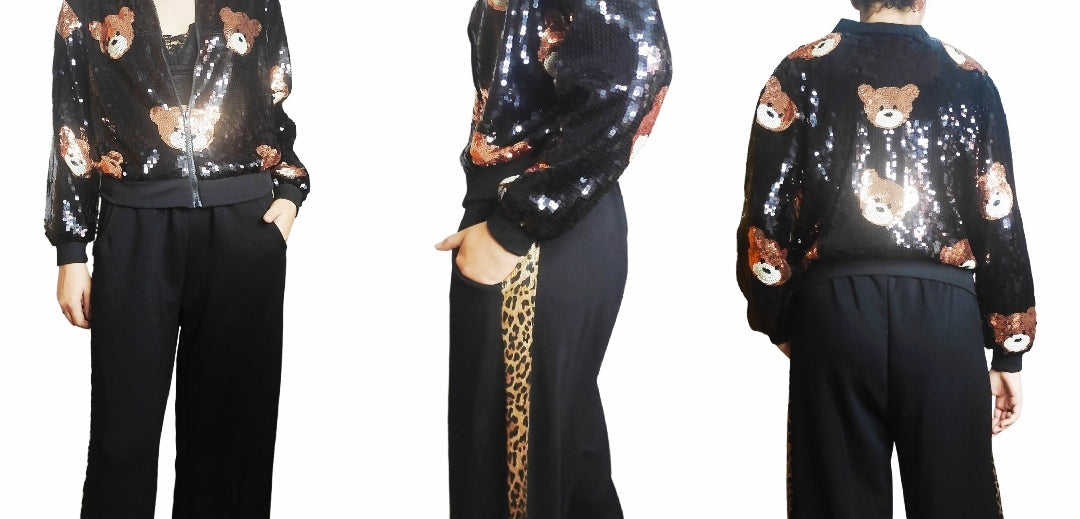 Add the coordinated bomber jacket and the leather bag.