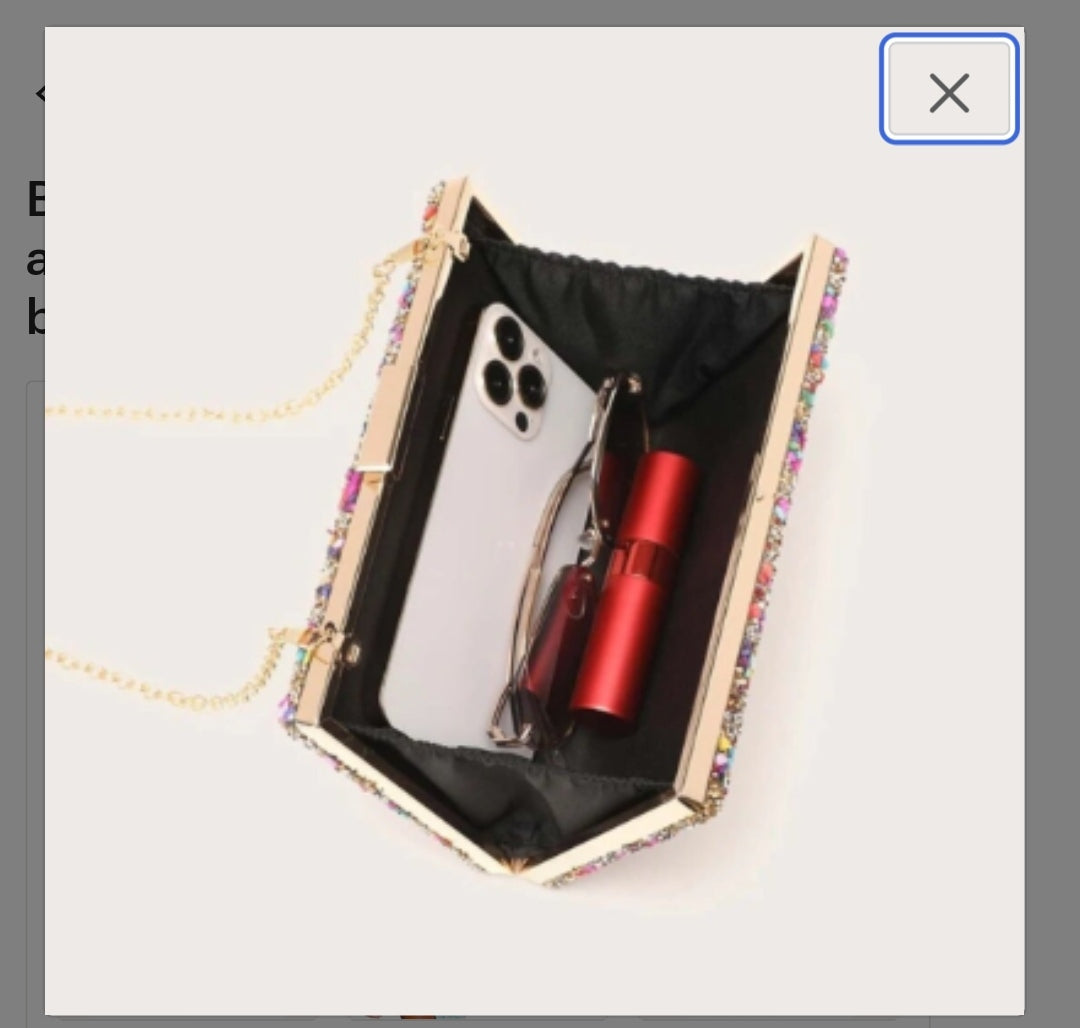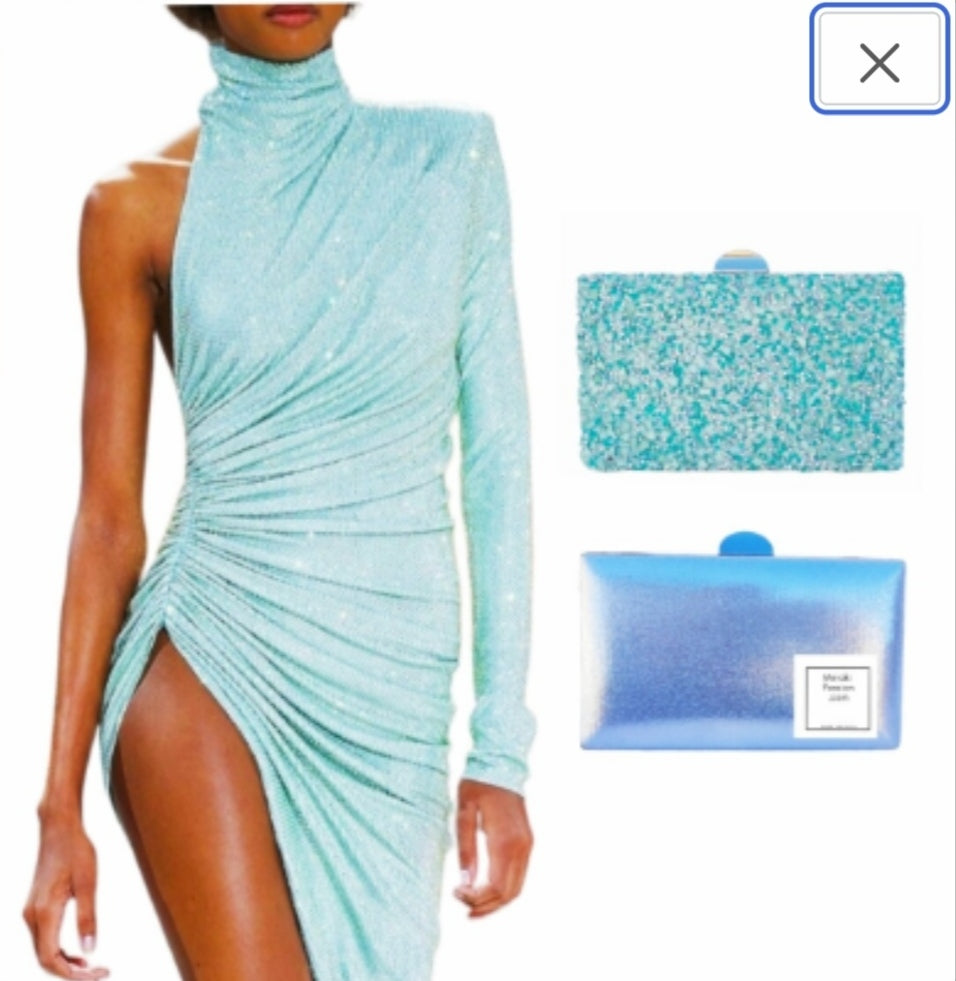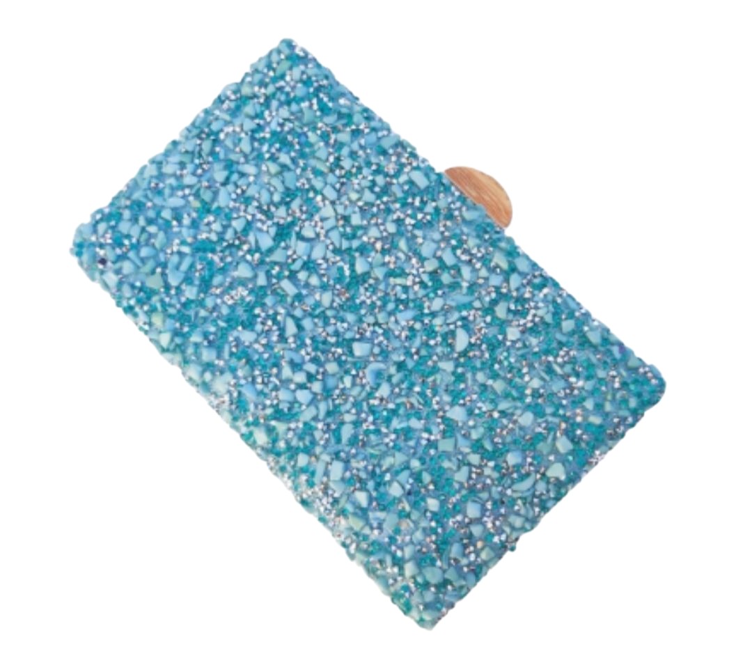 Rectangular bag decorated with rhinestones and shiny crystals, forming a pattern like a beautiful geode in aquamarine and silver tones.