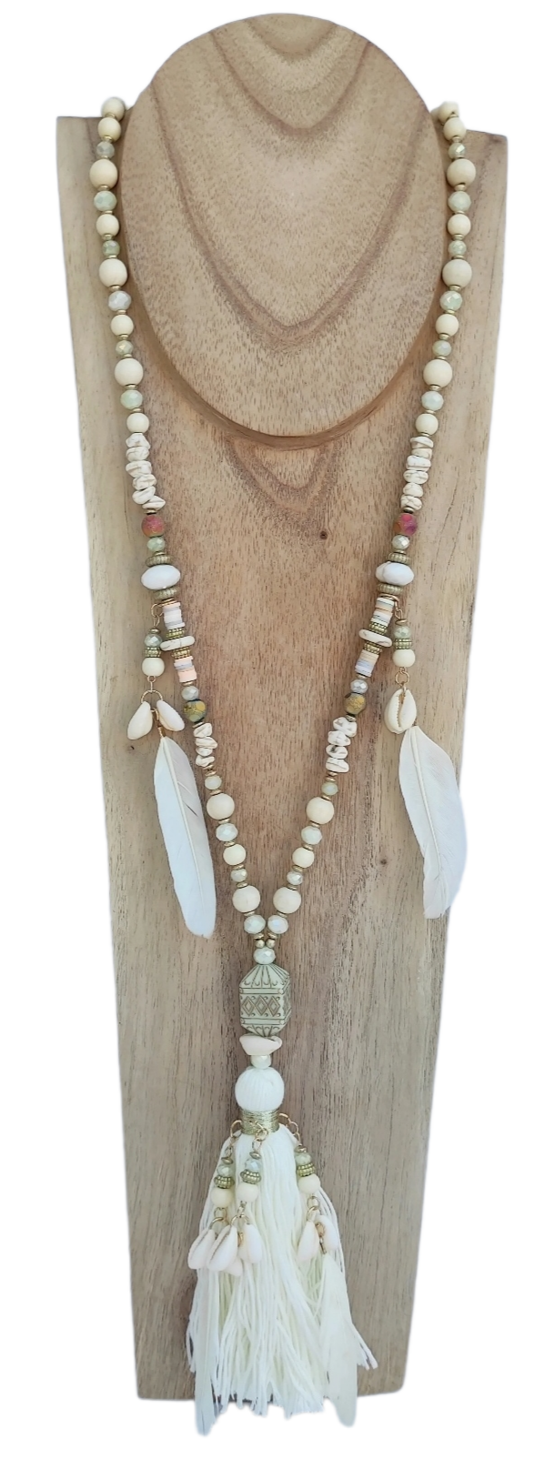 BEIGE and PASTEL PINK long necklace with tassel, shells and feathers