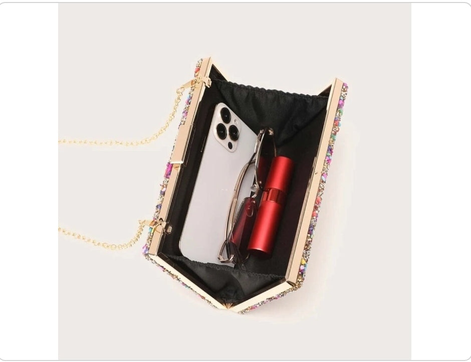 It can be worn hanging from its golden chain, or as a handbag. Supports changing the chain for others.