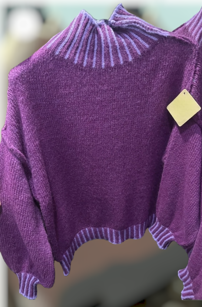 Snuggleable sweater. Available in gray and purple. Novelty