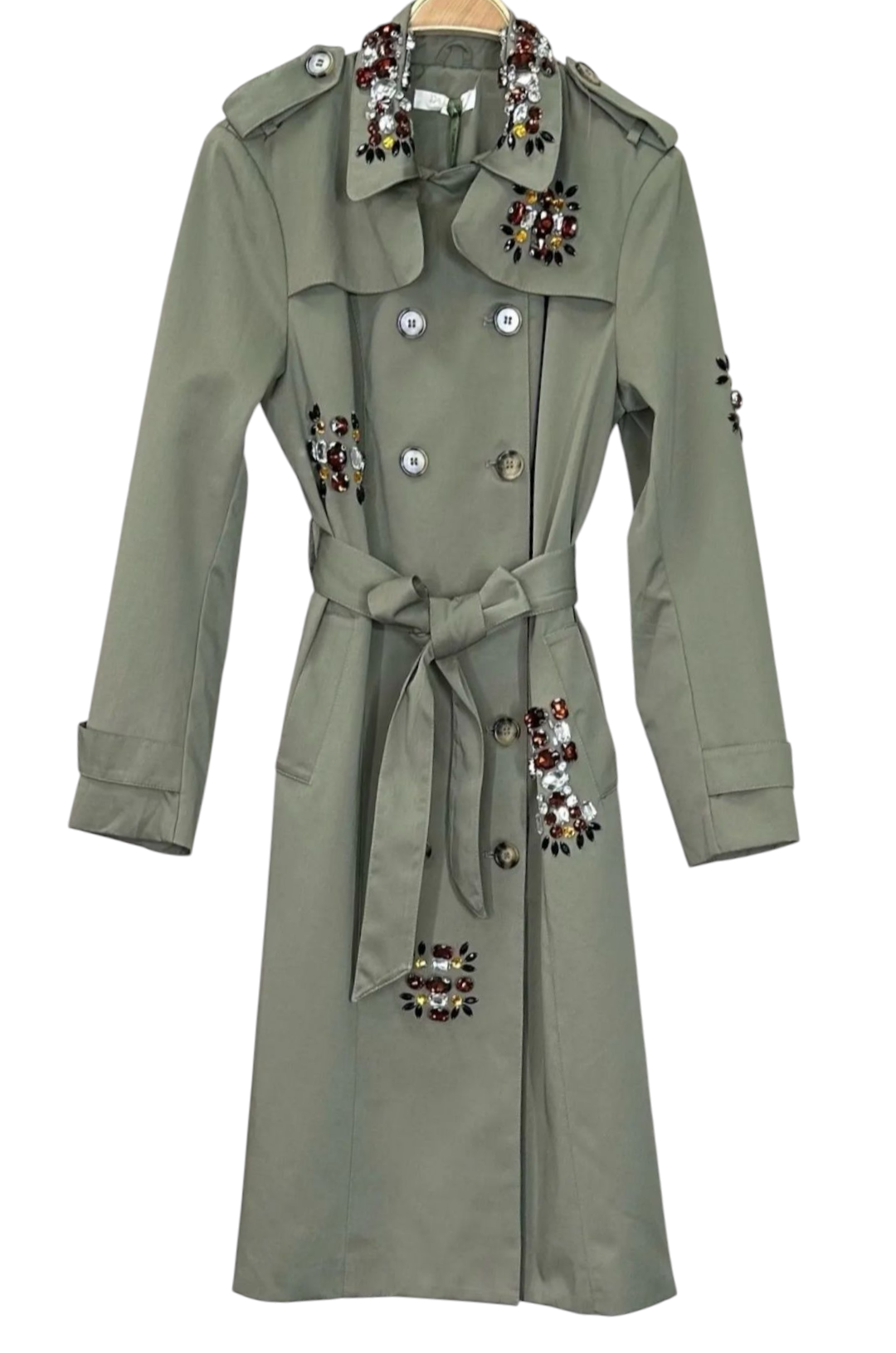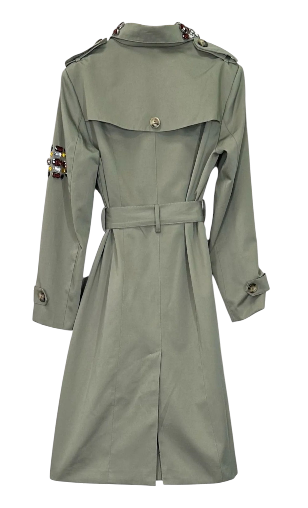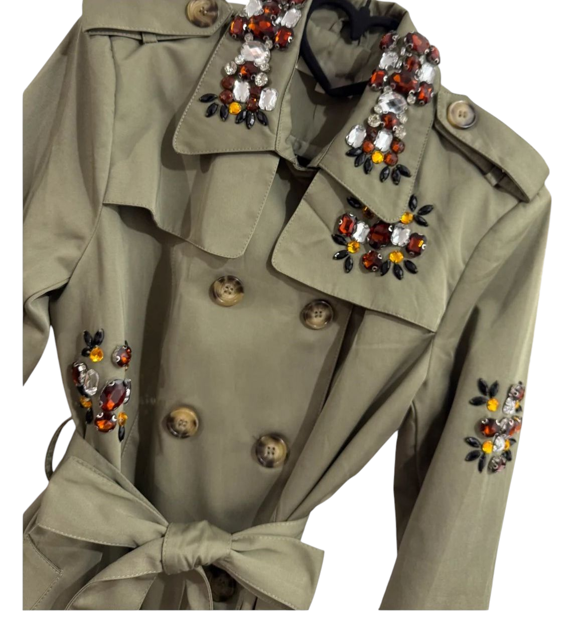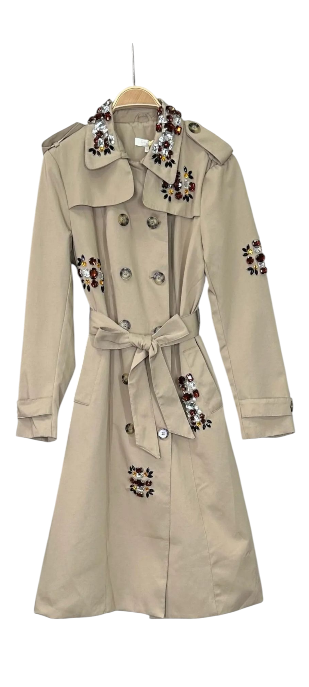 Gabardina muy femenina, de excelente calidad con pedrería bordada.