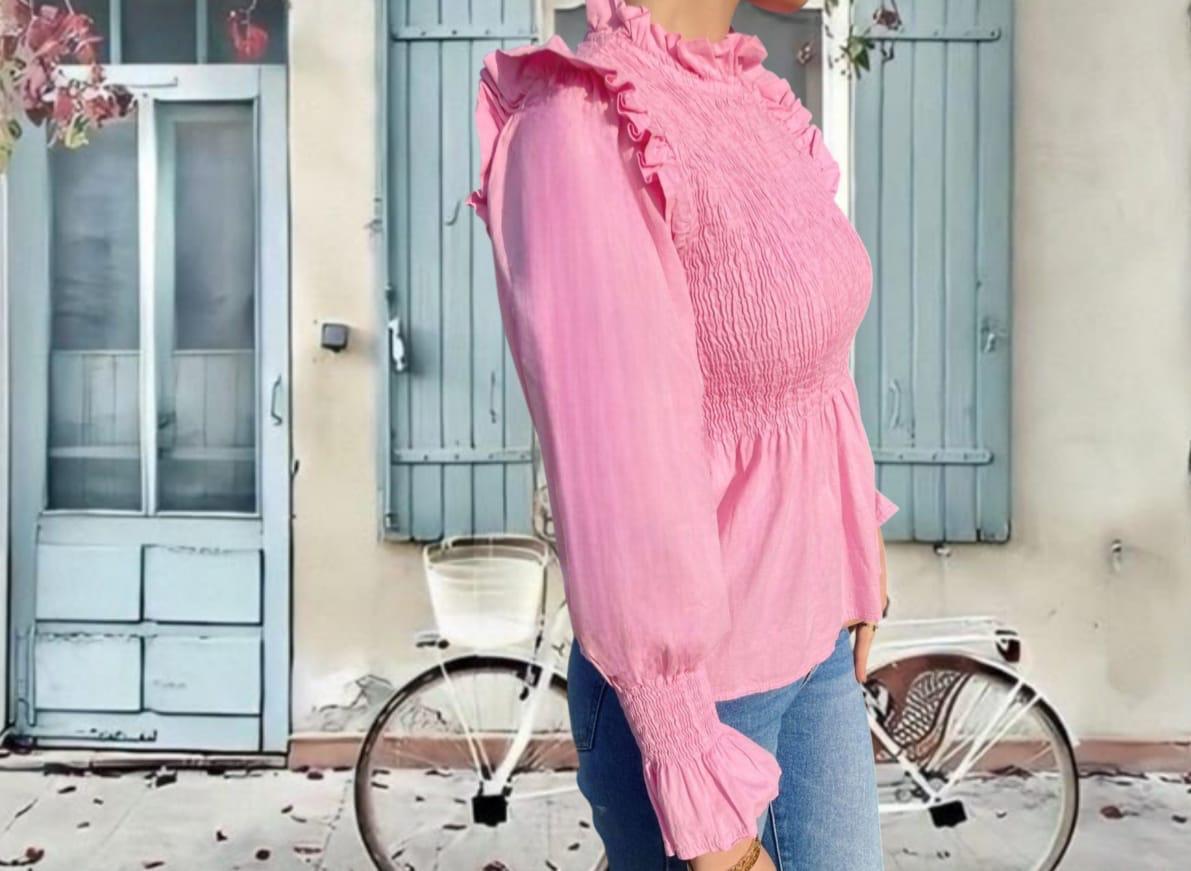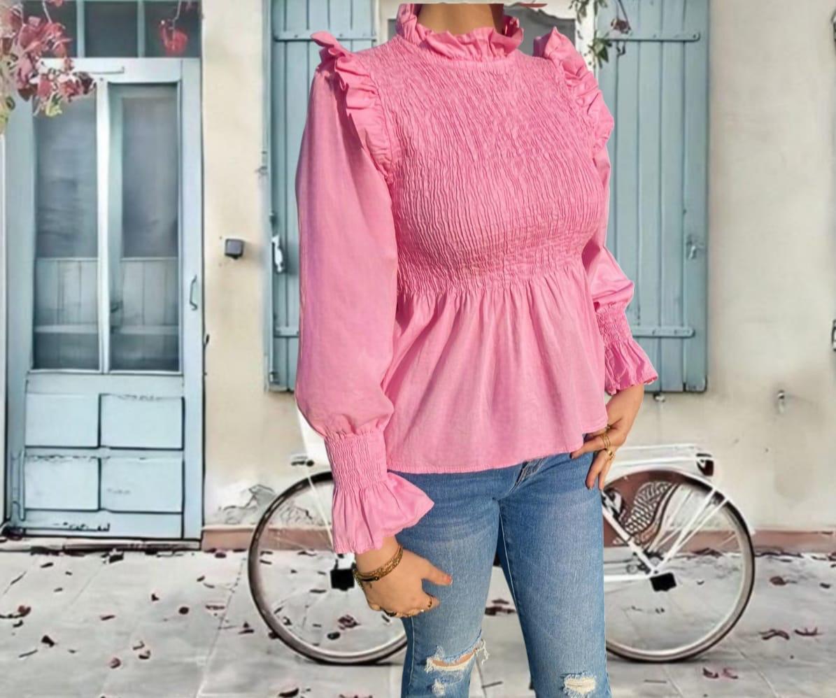 ¡Amiga, tienes que ver esta blusa porque es pura fantasía! Es de una rosa súper dulce, hecha de algodón 100 %, así que es comodísima y transpirable. Pero lo que realmente la hace especial es el panel de abeja en el pecho, que se ajusta divinamente a la figura, y esos mini volantes en el escote y las mangas... ¡pura elegancia con un toque romántico!