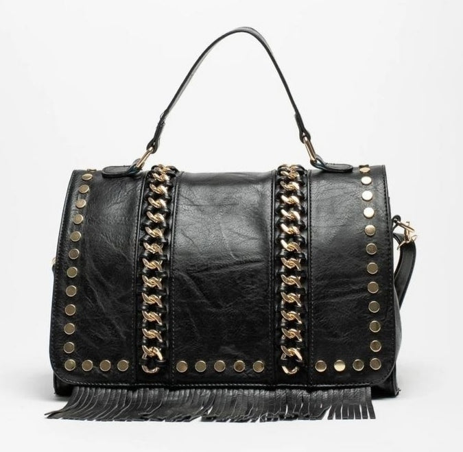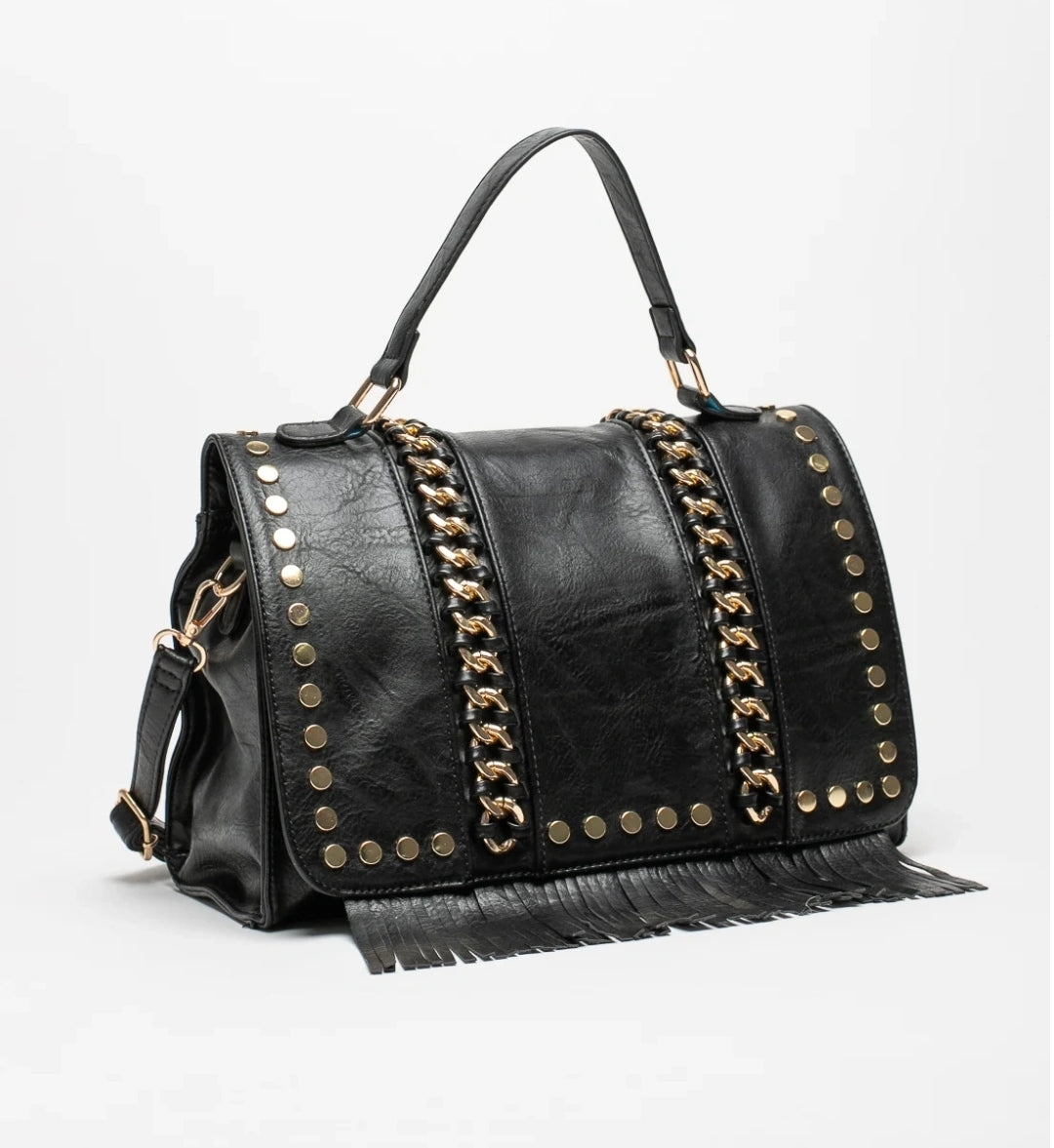Solapa con decoración de eslabones metalizados y tachuelas redondas, flecos en el extremo.