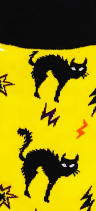 Divertidos calcetines de gatos negros y rayos sobre fondo amarillo.