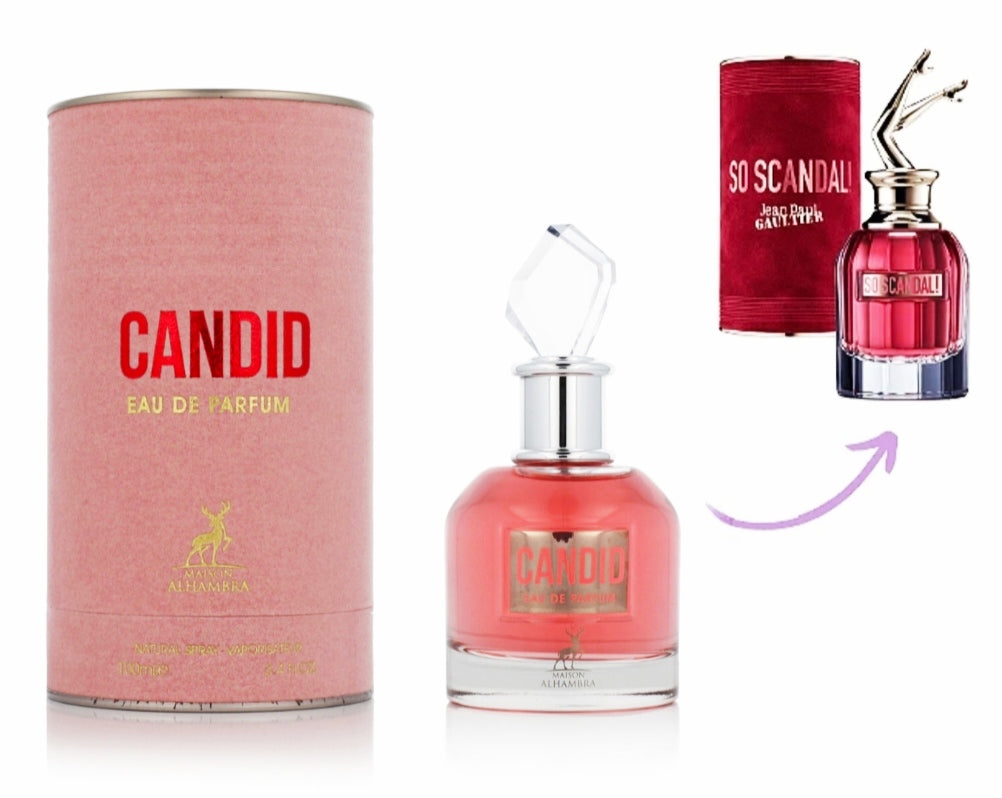 El perfume CANDID de Maison Alhambra by Lataffa es una fragancia sofisticada y lujosa para mujer. Puede Recordarte a Scandal de Jean Paul Gaultier, aunque con bastante más durabilidad.