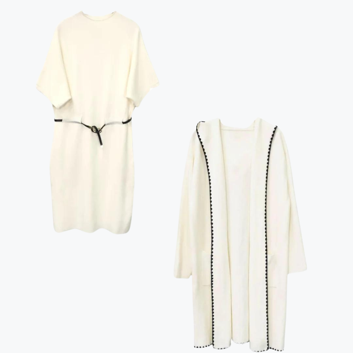 Vestido de corte minimalista con cinturón incorporado. Abrigo ribeteado.