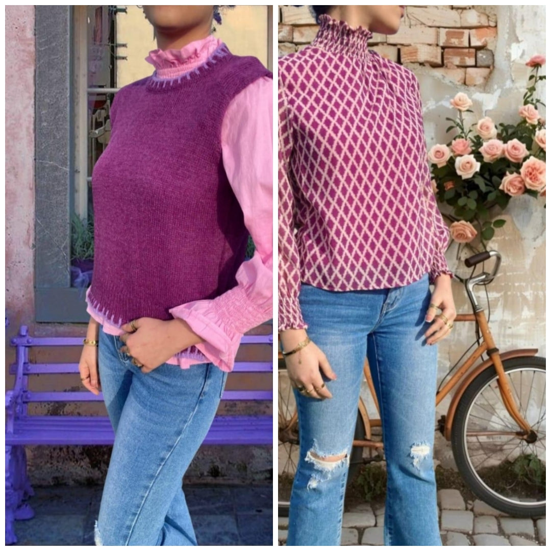 Chaleco de punto color morado ribeteado en color lila. Talla única: da hasta la talla 38 - 40.